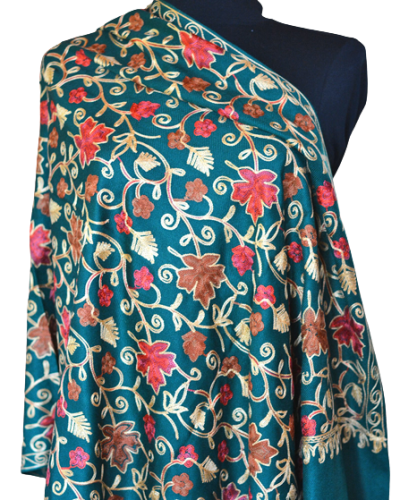 Szal z Paszminy Kalamkari to delikatne hafty wykonane ręcznie otaczające wzory wymalowane na szalu z czystej wełny z kóz górskich zwanych paszmina.