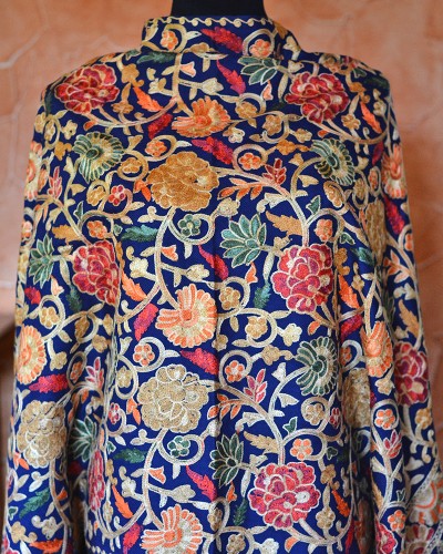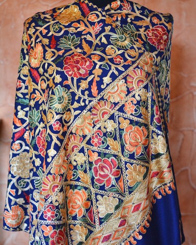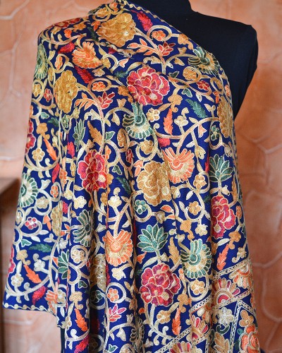 Szal z wełny kaszmirskiej wyszywany granatowy