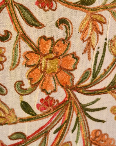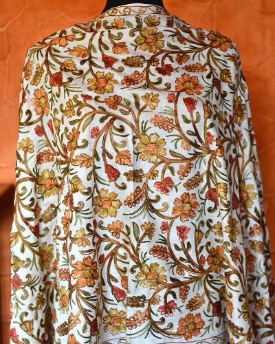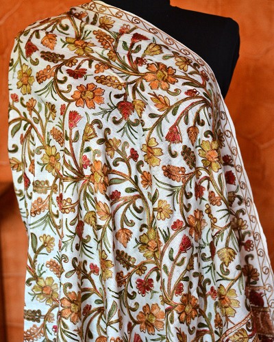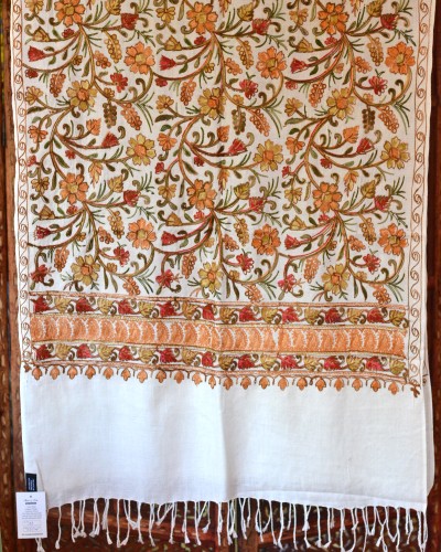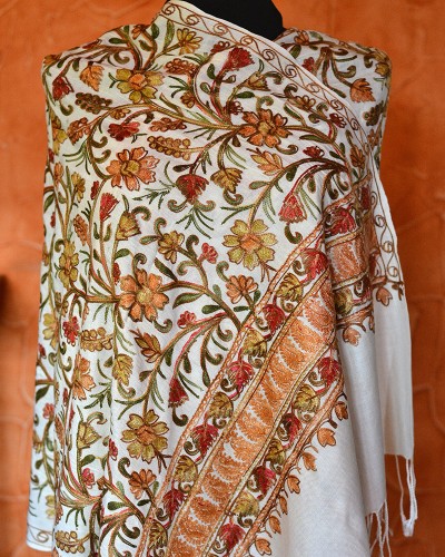 Szal z Wełny Kaszmirskiej Haftowany - Biały
