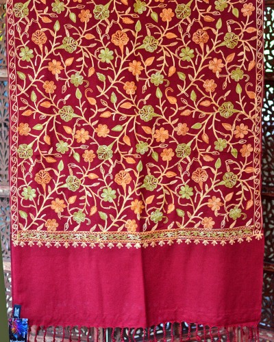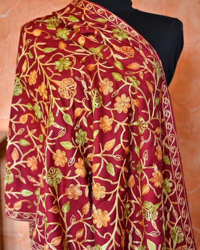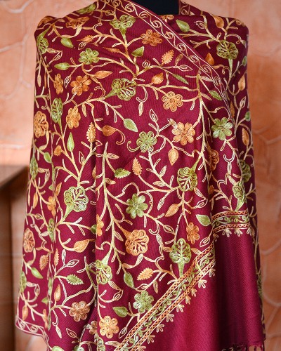 Szal z wełny kaszmirskiej wyszywany bordowy