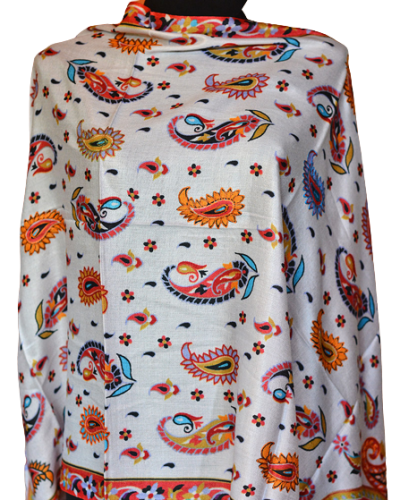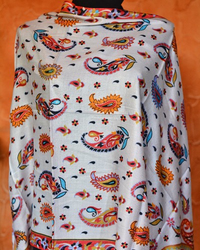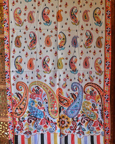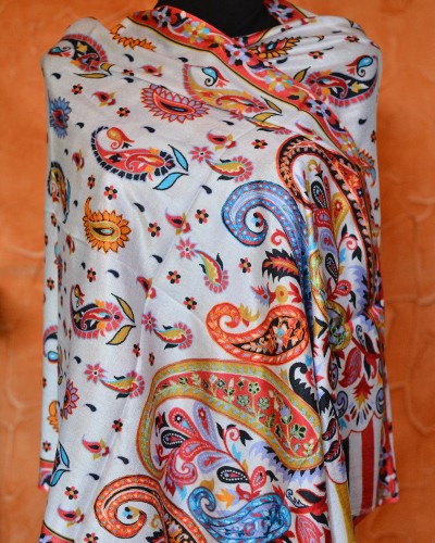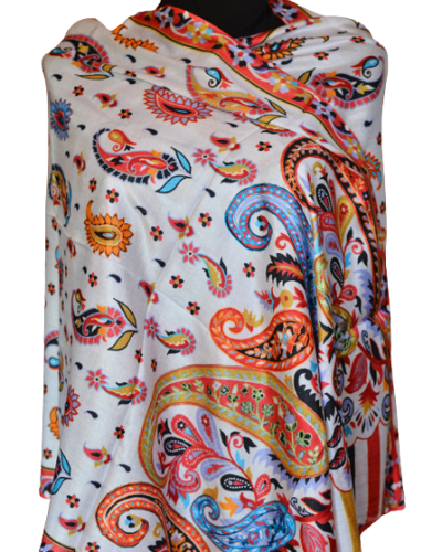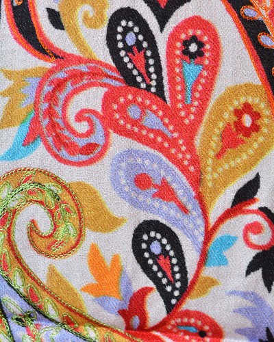 Nasze klientki będą zachwycone kolorowym wzorem, który świetnie współgra z każdą garderobą. Materiałem dominującym jest Silkwool Kalamkari Embroidered, który dodaje szalu wyjątkowego uroku i oryginalności.